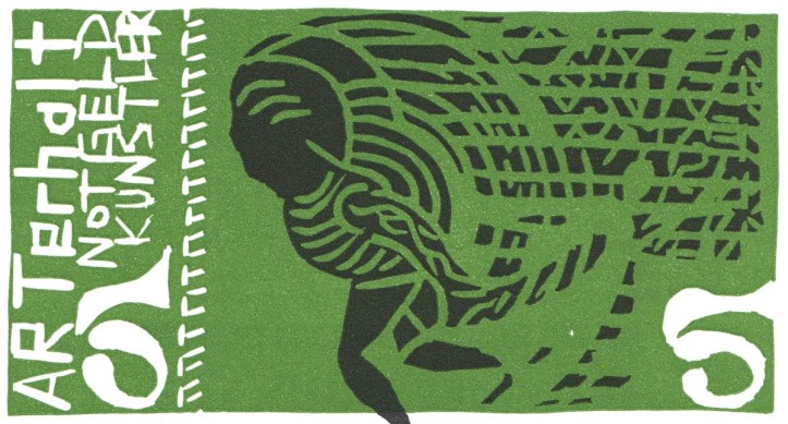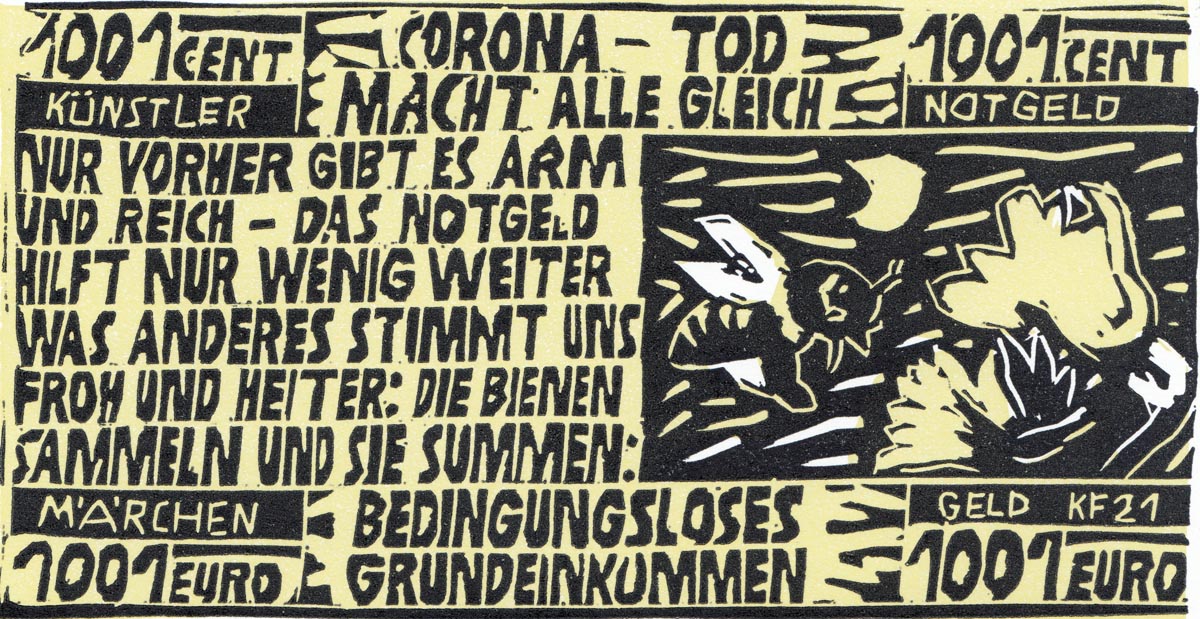Bereits zum Tag der Druckgrafik im März wurde deutschlandweit dazu aufgerufen Linoldrucke in der Form eines Geldscheins anzufertigen, die käuflich zu erwerben sind und dadurch einen kleinen Teil der Lücke in der Auftragslage der Betroffenen füllen und zeitgleich auf die Notlage von Künstlern, Theatermachern und Musiker aufmerksam machen.
