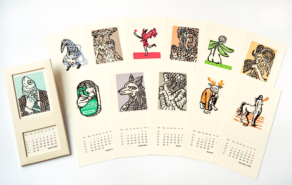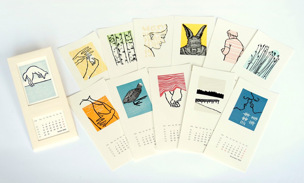 vier Wand- und Tischkalender, mit je zwölf Motiven,